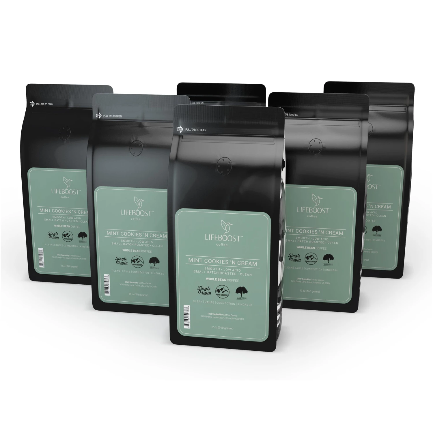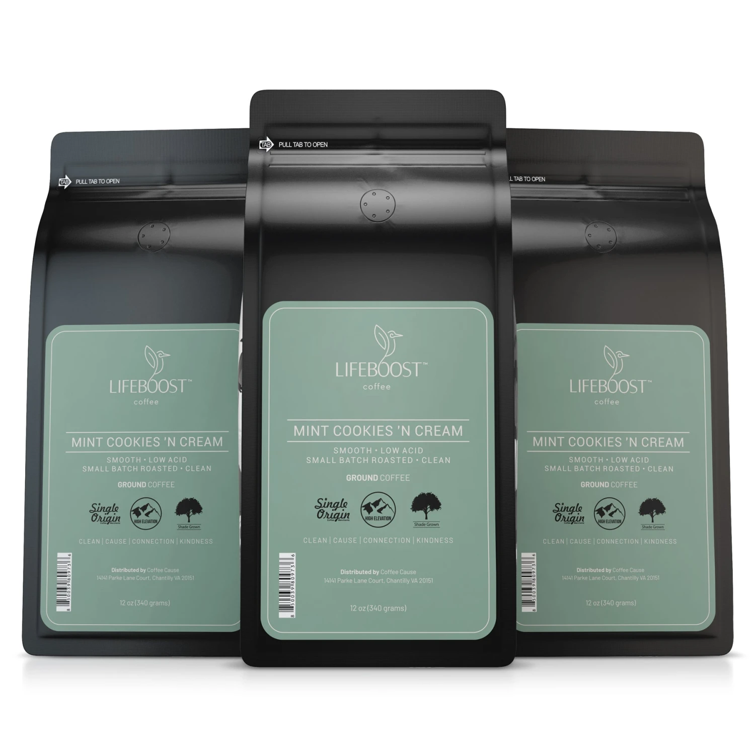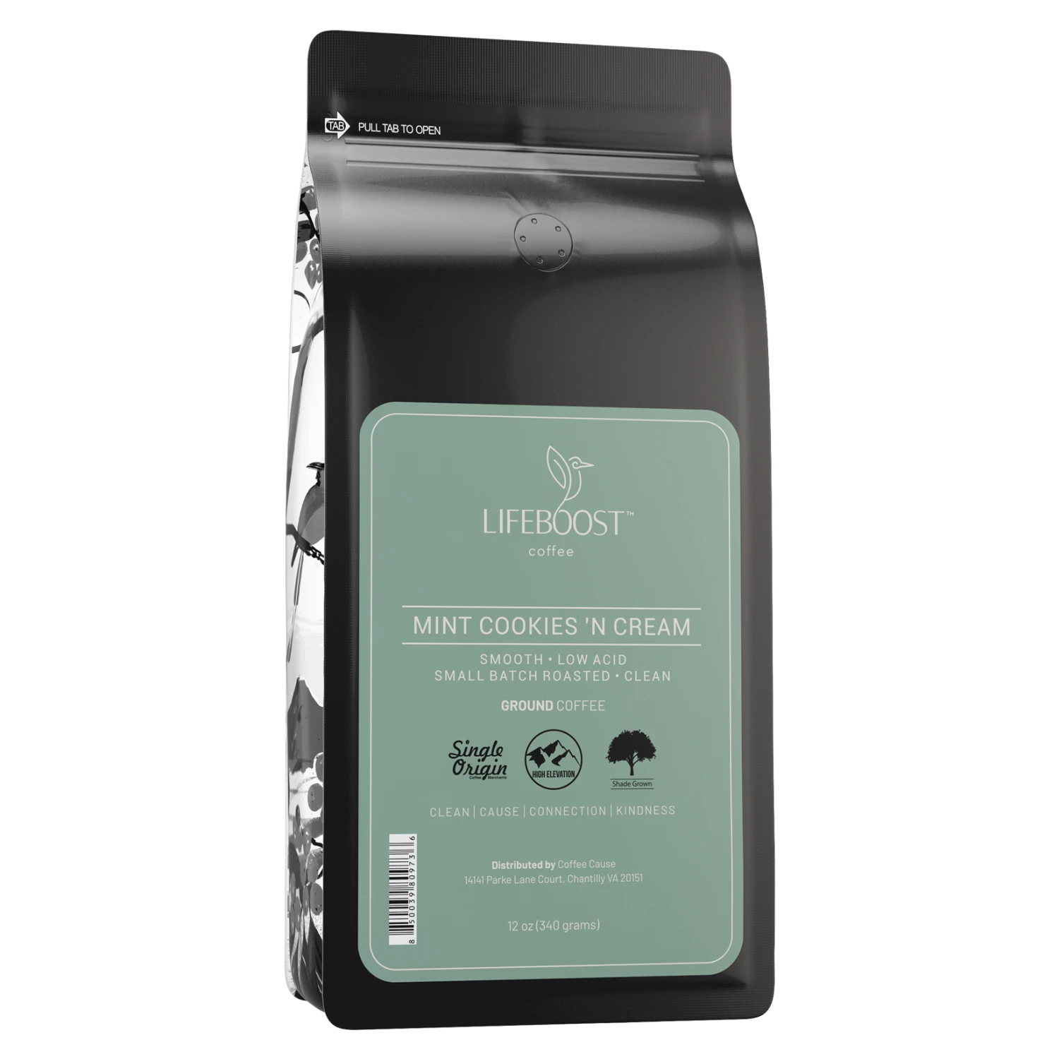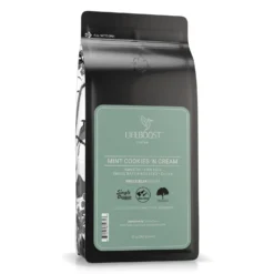 Creamy and smooth, refreshingly cool, tantalizingly sweet and decadent. Mint cookies ‘n cream Lifeboost coffee combines our smooth and bold, elevation grown, single origin, specialty, Arabica coffee beans with invitingly crisp mint extracts and the warm and familiar flavors of velvety smooth, creamy frosting sandwiched between sinfully dark and sweet chocolate cookies.