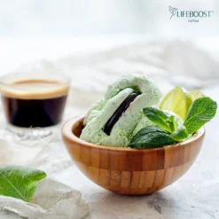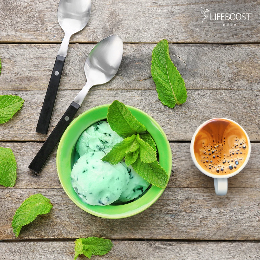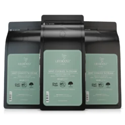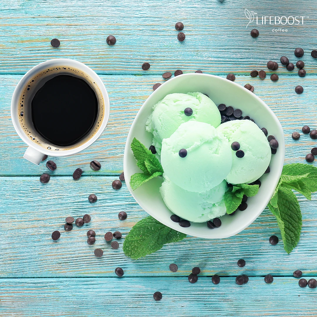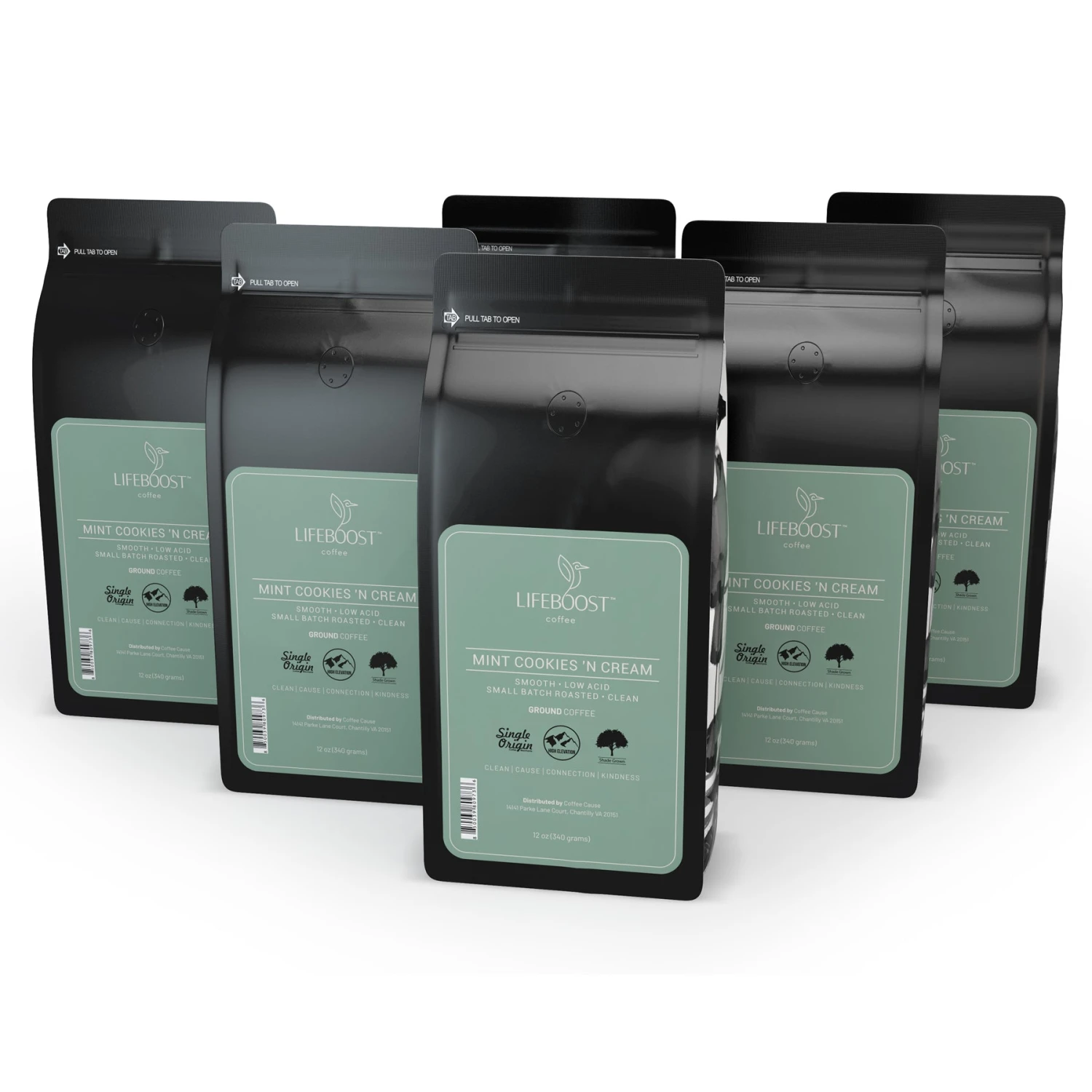 Creamy and smooth, refreshingly cool, tantalizingly sweet and decadent. Mint cookies ‘n cream Lifeboost coffee combines our smooth and bold, elevation grown, single origin, specialty, Arabica coffee beans with invitingly crisp mint extracts and the warm and familiar flavors of velvety smooth, creamy frosting sandwiched between sinfully dark and sweet chocolate cookies.