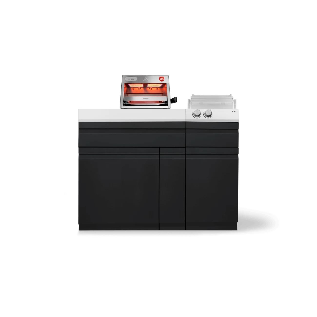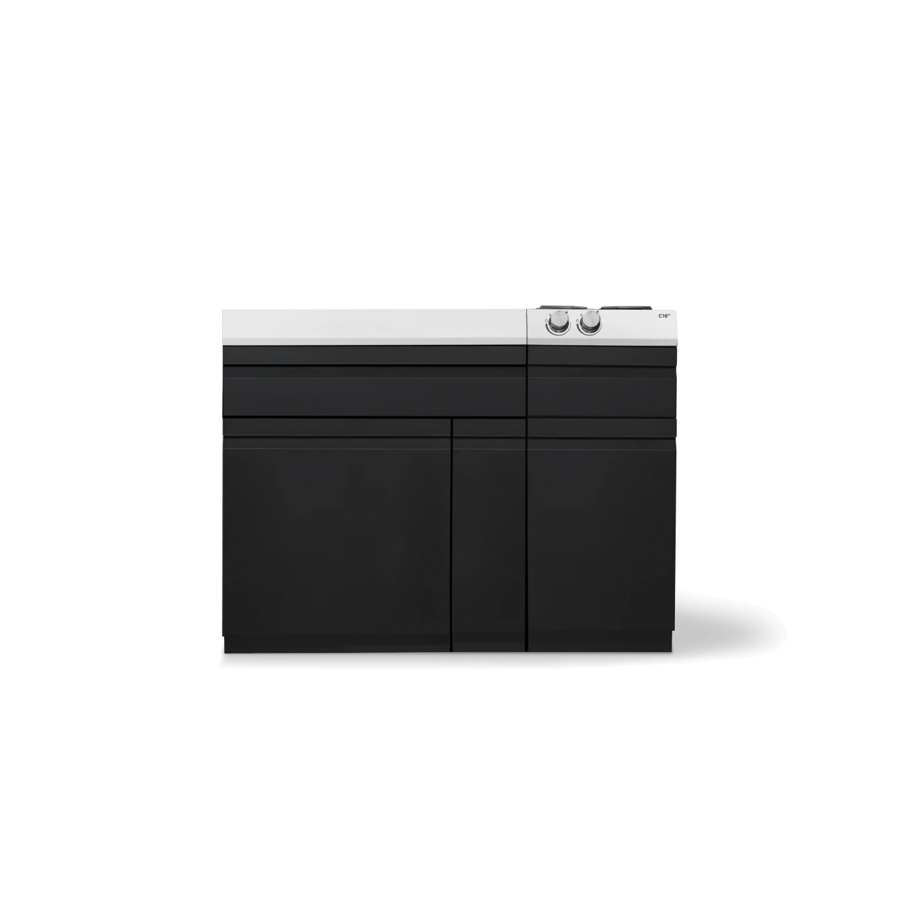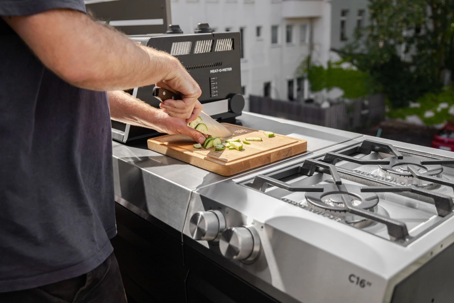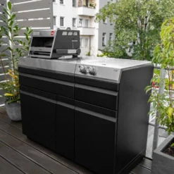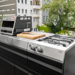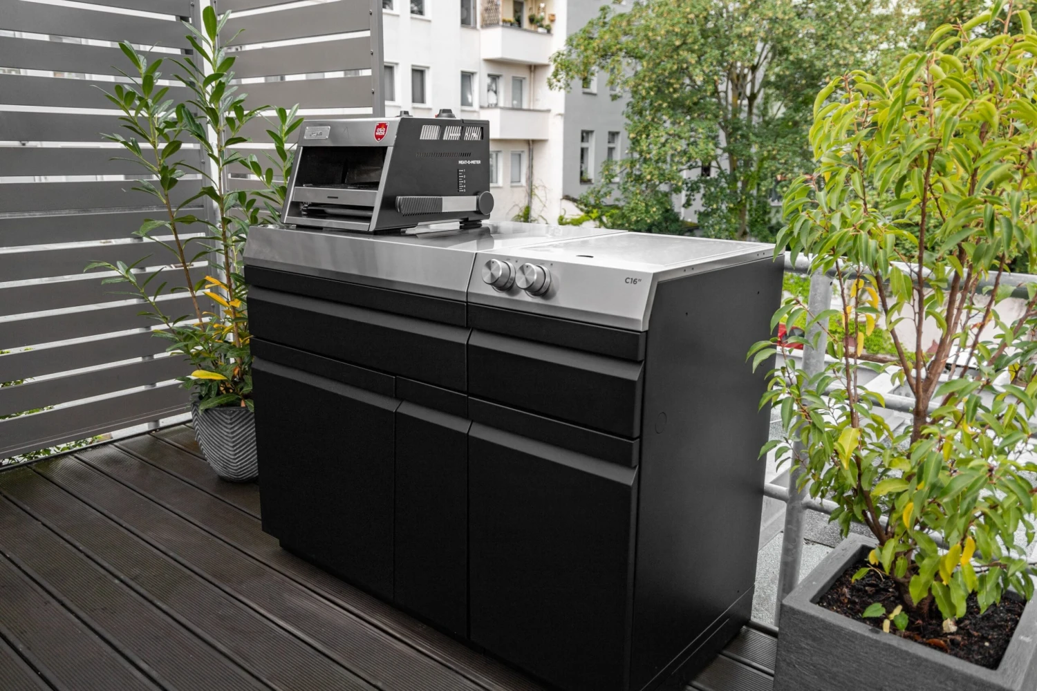 Auf 1,23m vereint die Outdoor-Küche „Paris“ deine Träume auf kleinstem Raum: Kochfeld C16, Arbeitsfläche und Stauraum. Und in der Premium-Version ist sogar der Oberhitzegrill O.F.B. mit dabei. Perfekt nicht nur für den Balkon.