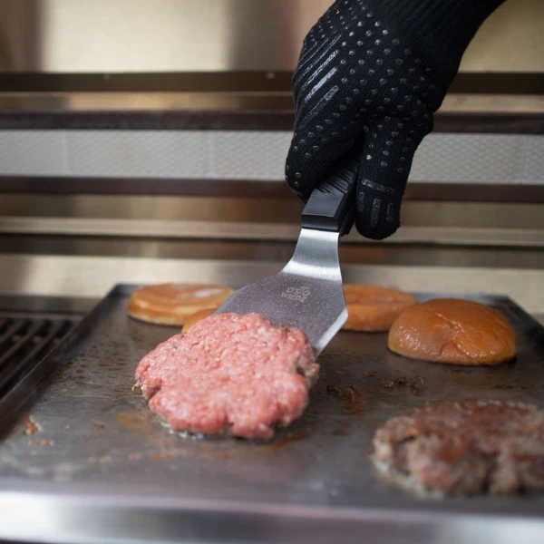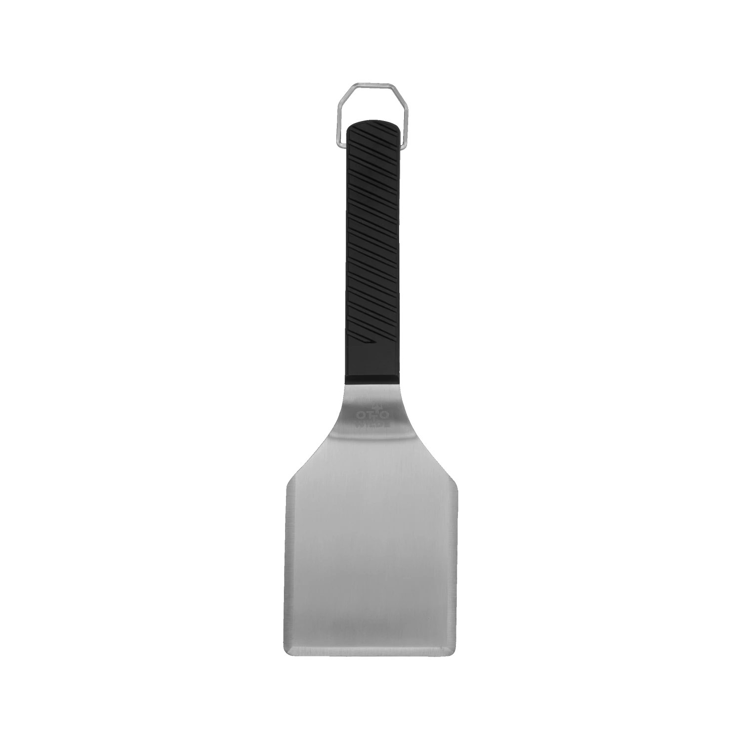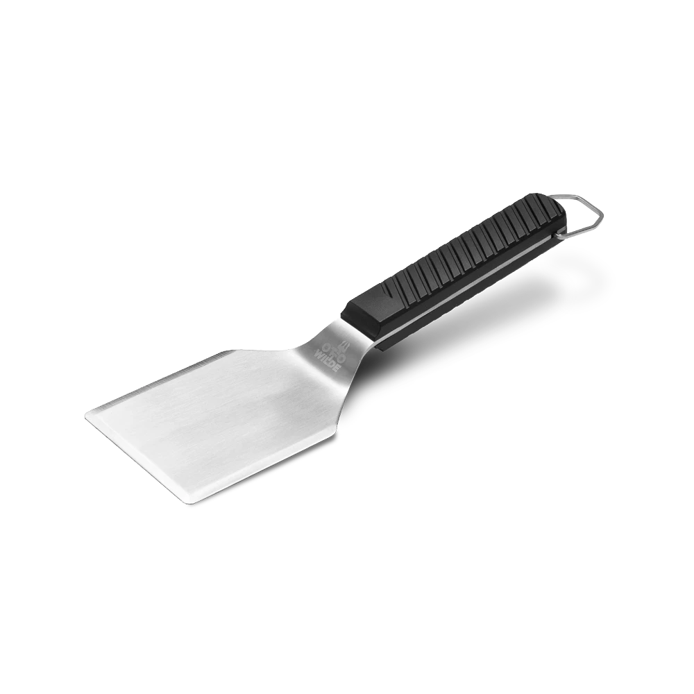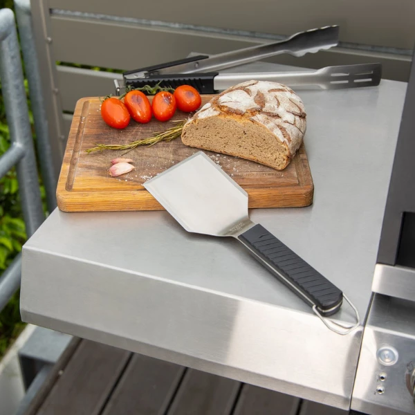 Grillspachtel aus Edelstahl mit Griff aus Kunststoff.