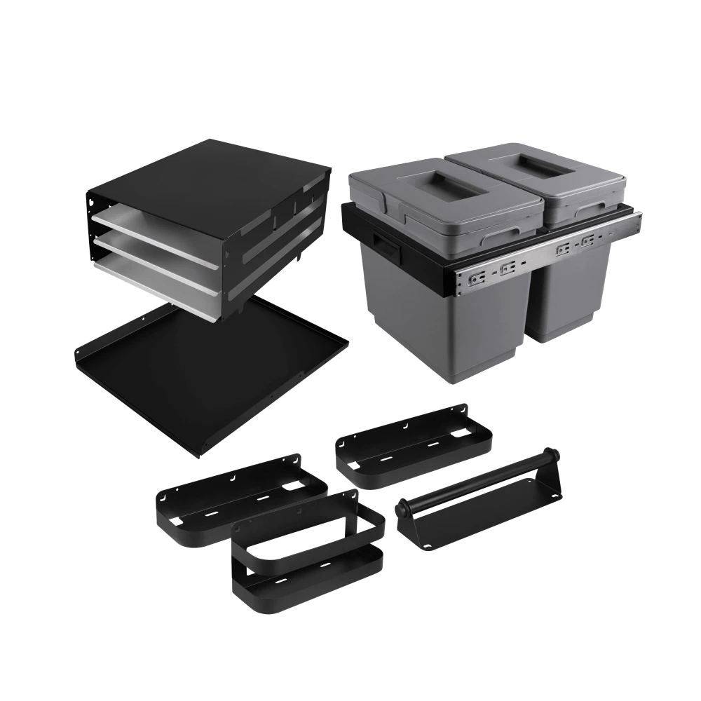 Bringt die optimierte Ordnung in dein Stauraummodul S32 . Mit den Ablagen holst du aus den Türen jeden Zentimeter an Stauraum raus, die Schränke teilst du mit dem Regalboden und dem Einbausatz auf und das ausziehbare Abfallsystem erspart dir den Weg zum Mülleimer.